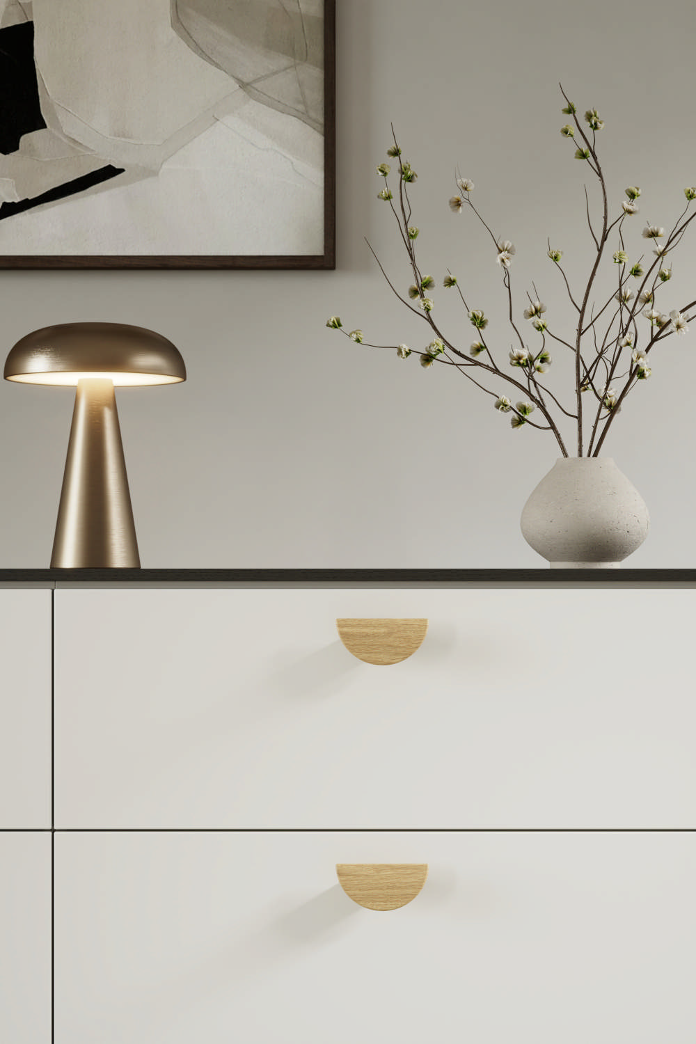 Horizon appears to float above the panel surface. It has a half moon shape and an elegant transition from flat to curved on the front face. The design is suited to any orientation with two handles mounted across adjacent panels making a complete circle.